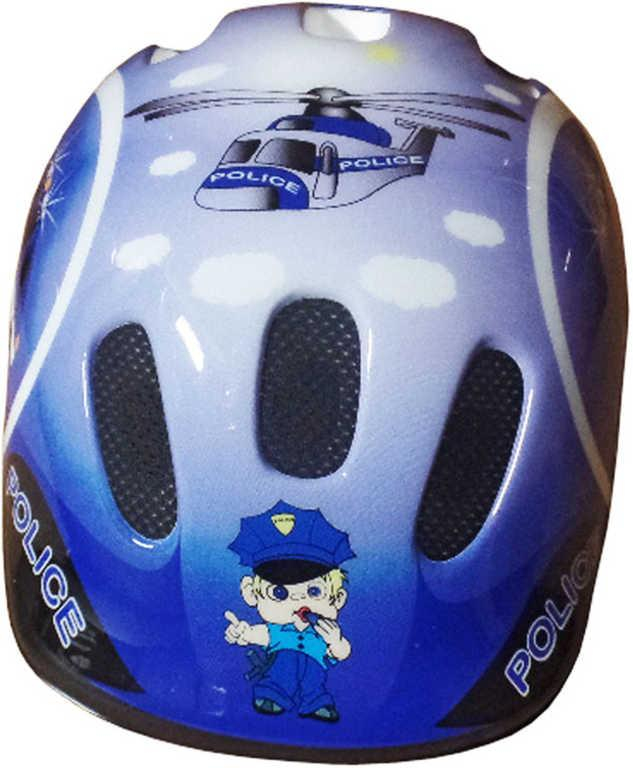Cyklohelma dětská v modré barvě na kolo, s potiskem s motivy policie, pro všechny malé policajty, ve velikosti XS (44-48 cm) a o hmotnosti 180g. Helma má 6 velkých větracích otvorů, síťku proti hmyzu, bílý EPS, stahovací pásek se šroubem okolo hlavy pro dokonalé upnutí. Cena je uvedena za 1 kus výrobku