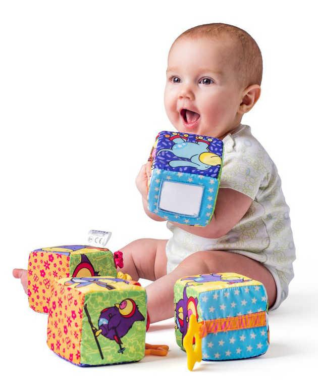 Sada čtyř měkkých pestrobarevných soft obrázkových kostek s aktivitami pro nejmenší děti. Baleno v praktické igelitové tašce se zapínáním na zip. Všechny látkové kostky obsahují různé hrací komponenty: chrastítka, kousátka, pískátka, zrcátko vyrobené z bezpečnostní fólie, ve kterém může dítě pozorovat svůj obličej a části vydávající zvuky mačkaného papíru. Všechny tyto komponenty stimulují dětské smysly i jemnou motoriku. Design německé návrhářky Britty Hurter. Hračky pro nejmenší děti mají krásný vzhled, jsou lehké a navíc fungují jako aktivní hračky - stimulují dítě vizuálně i prostřednictvím hmatu. Hrklávka/štěrchátko je odjakživa oblíbená hračka těch nejmenších. Chrastící zvuk děti uklidňuje, navíc se děťátko učí vnímat a zpracovávat okolní podněty. Hračka na kousání (kousátko) je velmi užitečná hračka - děťátko může zkoumat různé tvary a povrchy kousátka a přitom ulevit rostoucím zoubkům. Rozměry balení (š v h): 18 x 18 x 9cm Velikost kostek: 9cm Materiál: textil, plast Obsah balení: měkká kostka 4ks Cena je uvedena za 1 balení - sadu hračky Hračka je vhodná pro děti od narození