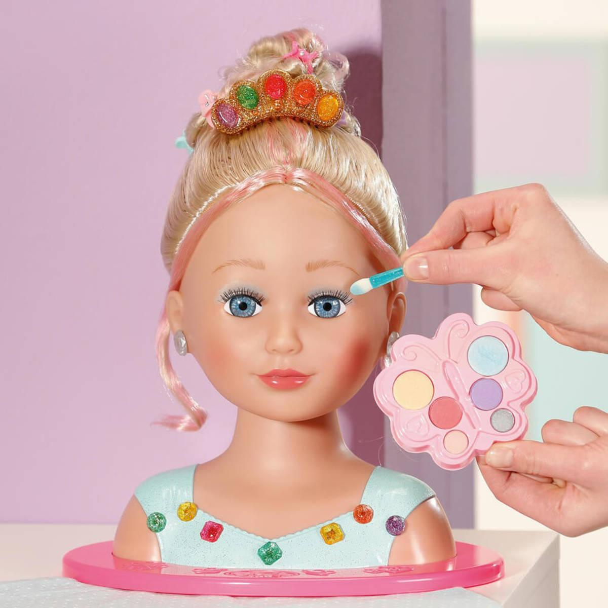 Tato stylingová hlava BABY born Sister je vhodná pro princeznu s citem pro styl! Mladí vizážisté nyní mohou vytvářet úžasné líčení s barevnou a dermatologicky testovanou paletou líčidel. Stylingovou hlavu s prvotřídními blond vlasy a jemnými, pastelově zbarvenými melíry lze snadno upravit pomocí jejích třpytivých cvoků, sponek, sponek a kartáče na vlasy. Ať už jde o elegantní účes nebo zábavný cop - možnosti stylingu jsou s hlavou BABY born Sister Styling Head Princess nekonečné. Žádná princezna by nebyla kompletní bez čelenky! Třpytivé sponky s drahokamy můžete použít k aktualizaci a změně stylu diadému a lze je použít i jako náušnice nebo na její vršek. Vyrůstá vám doma nadějná kadeřnice? Naše kadeřnická sada s česací hlavou jí zajisté splní sen. Rozměry balení (š v h): 27 x 27 x 18,5cm Materiál: plast, textil Obsah balení: česací hlava, paletka na líčení, kartáč na vlasy, 8 sponek do vlasů, hřebínek, čelenka a další doplňky Cena je uvedena za 1 balení - sadu hračky Hračka je vhodná pro děti od 4 let